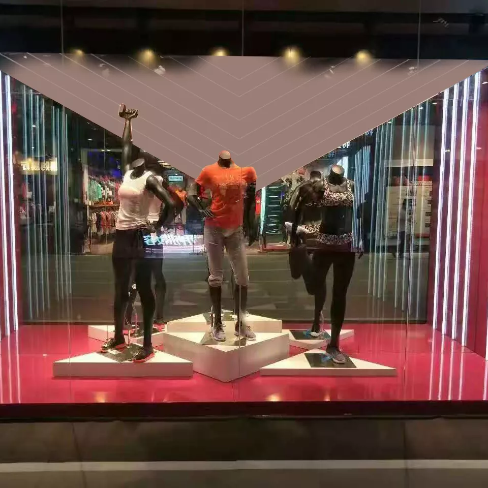 En las pantallas de la ventana, el color es el primer factor que atrae el ojo. Los diseñadores a menudo usan telas deportivas brillantes y contrastantes, como poliéster brillante, malla de secado rápido o materiales reflectantes. Estas telas no solo pueden captar rápidamente la atención de los peatones a larga distancia o en condiciones de iluminación complejas, sino que a menudo también están hechas de materiales científicos que reflejan las características de los deportes, como secado rápido, absorción de sudor, compresión, protección solar o calidez. La funcionalidad se implica mostrando los pliegues, texturas o estructuras especiales (como empalme y malla) de la ropa.